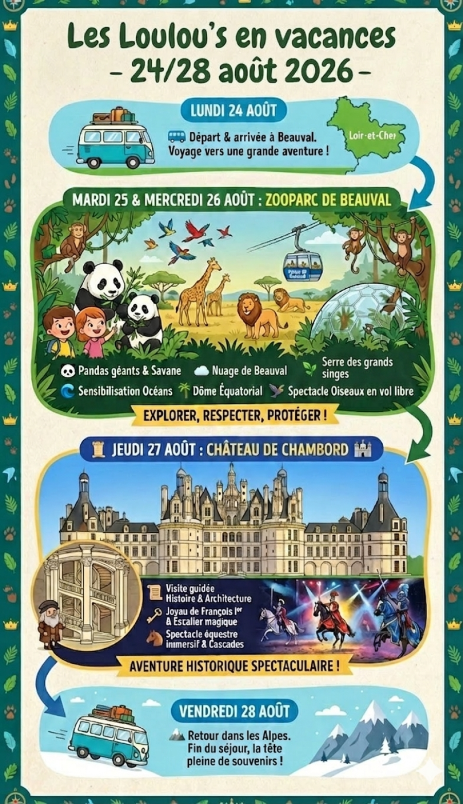 Cette année, et pour la 11ème édition des "Loulou's en vacances", les Loulou's & le Castelou te re-donnent rendez-vous au zoo de Beauval, l'un des plus beaux zoos du monde . Partons du lundi 24 au vendredi 28 août 2026, le temps d'un séjour pour s'émerveiller, voyager, partager un moment fort... Alors, fais tes valises & partons à la rencontre des animaux fantastiques!
